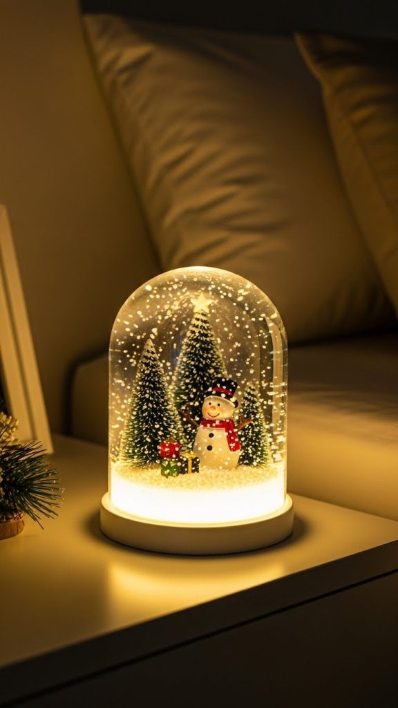 Place a warm LED light inside or beneath the globe to create a glowing effect that highlights the scene. For real snow globe charm, sprinkle fine glitter inside the dome which sparkles beautifully when illuminated. Some versions of this lamp can even be gently shaken for a falling snow effect.