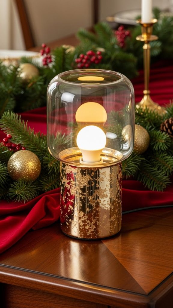 Snow globe lamps look wonderful on bedside tables, office desks, or living room side tables. This lamp idea brings nostalgia and childlike joy to your holiday decor, making it a favorite for both kids and adults.