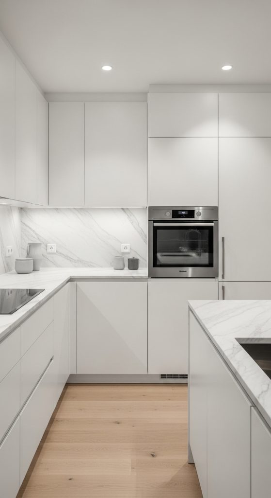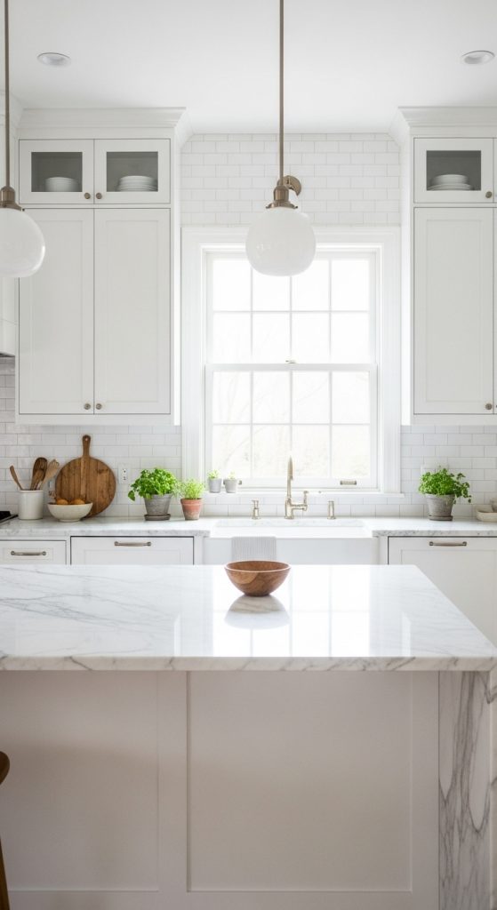Use a variety of white shades and textures to add dimension. Glossy cabinets, marble countertops, and subway tile backsplashes blend seamlessly to create a harmonious look. To prevent the space from feeling sterile, incorporate wooden elements or plants for warmth and contrast.