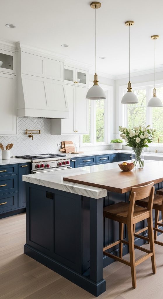 Common combinations include white upper cabinets with navy or forest green lower cabinets, or wood and matte black finishes. This technique adds depth and contrast without overwhelming the space.