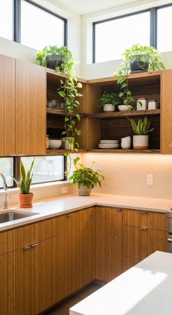 Choose materials such as bamboo, reclaimed wood, stone, and recycled glass for countertops, cabinets, and flooring. Energy-efficient appliances and LED lighting reduce electricity consumption. Adding indoor plants can also improve air quality while creating a calming atmosphere.