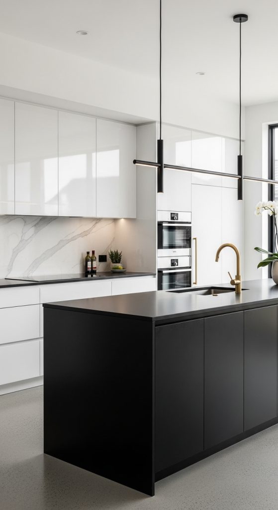 The black and white combination remains one of the most striking and timeless color schemes in modern kitchen design. This high-contrast palette offers sophistication and drama while keeping the overall look clean and elegant.