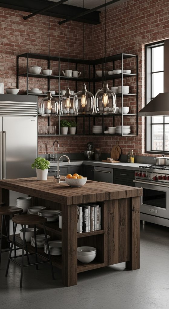 Exposed brick walls, concrete countertops, and metal fixtures define the industrial look. Opt for open shelving with black steel frames or reclaimed wood surfaces to emphasize texture and contrast. Pendant lights with metal shades or Edison bulbs can add a warm, vintage glow.