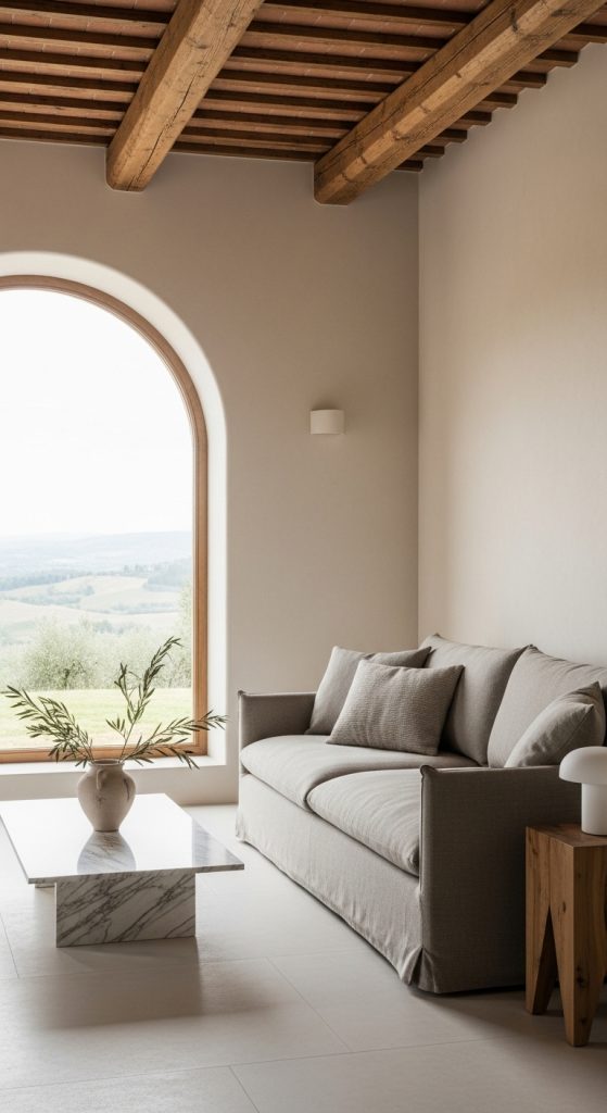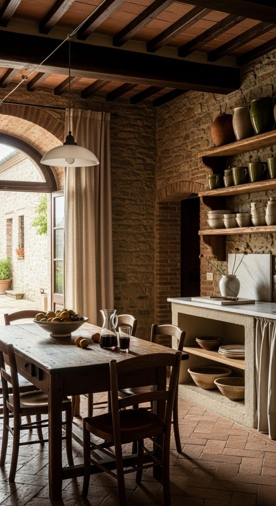 For a Tuscan vibe, paint your walls in soft ochre or warm beige tones, then complement them with natural stone floors or ceramic tiles. This palette brings the warmth of Italian sunlight directly into your home.