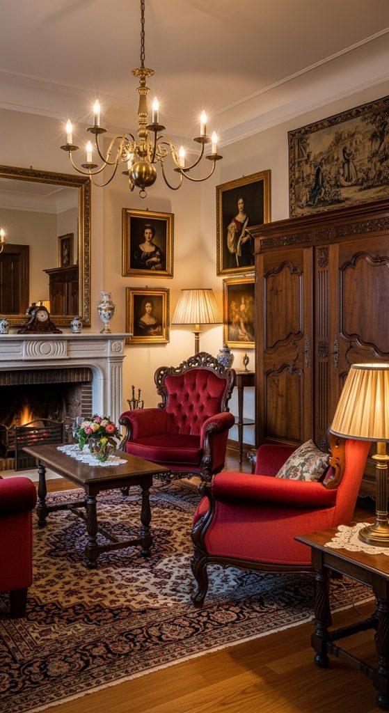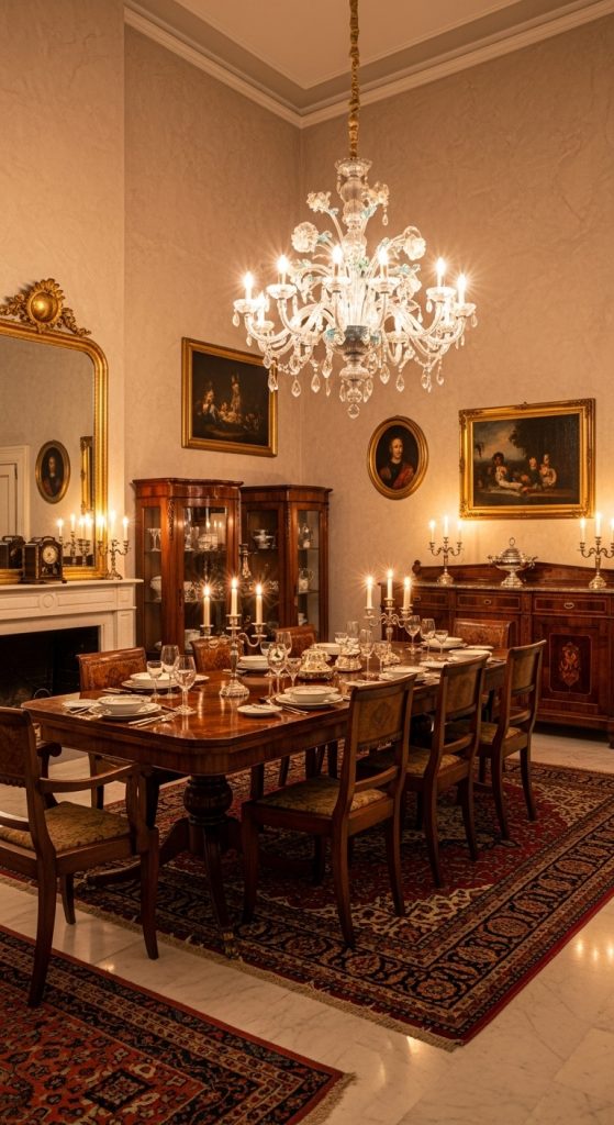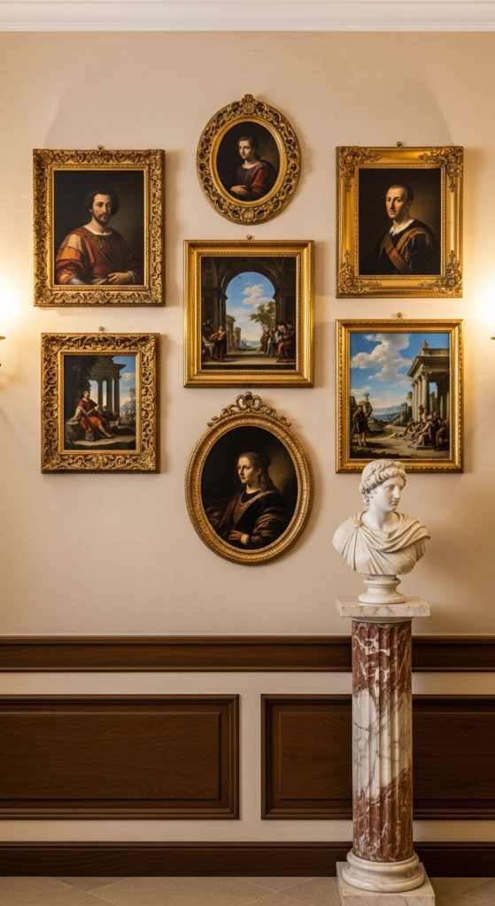 Classical paintings, sculptures, and fresco-inspired wall art can add a touch of sophistication. You can also display family portraits or vintage photographs in ornate frames for a personal touch.