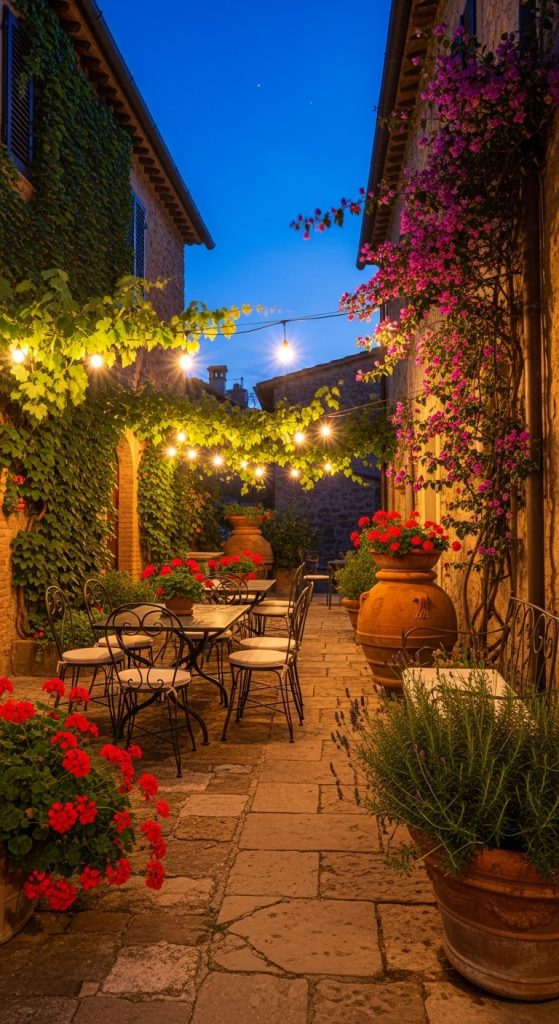 If you have a patio or garden, decorate it with wrought-iron furniture, terracotta pots filled with herbs or flowers, and stone pathways. Climbing vines, olive trees, and lavender plants bring authentic Italian countryside charm.