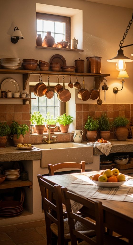 Decorate with fresh herbs, olive oil bottles, and ceramic jars — simple elements that celebrate Italian culinary culture. The goal is to create a space that feels lived-in, functional, and full of life.