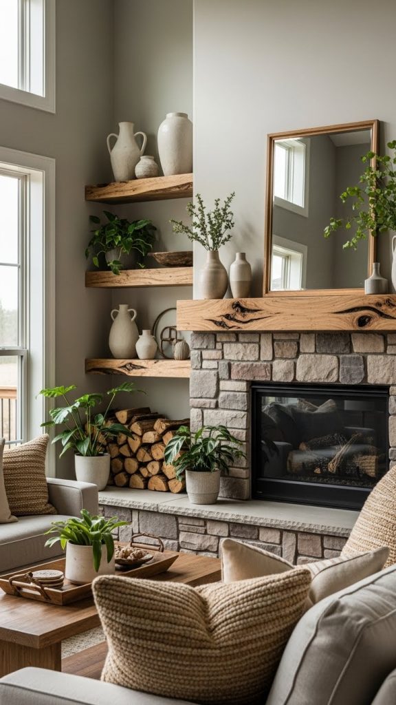 For styling, keep the decor simple. Use earthy tones, ceramic vases, and greenery to complement the wood. Avoid overcrowding the shelves so the natural edge remains the star of the space.