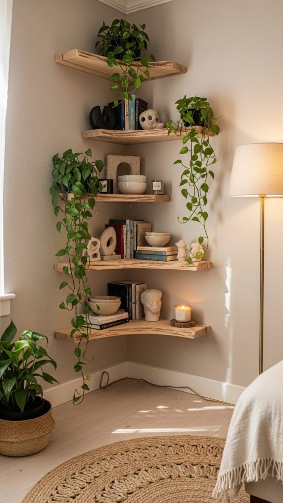 Use corner shelves to display plants, books, or decorative objects. This idea works especially well in cozy reading nooks or bedroom corners.