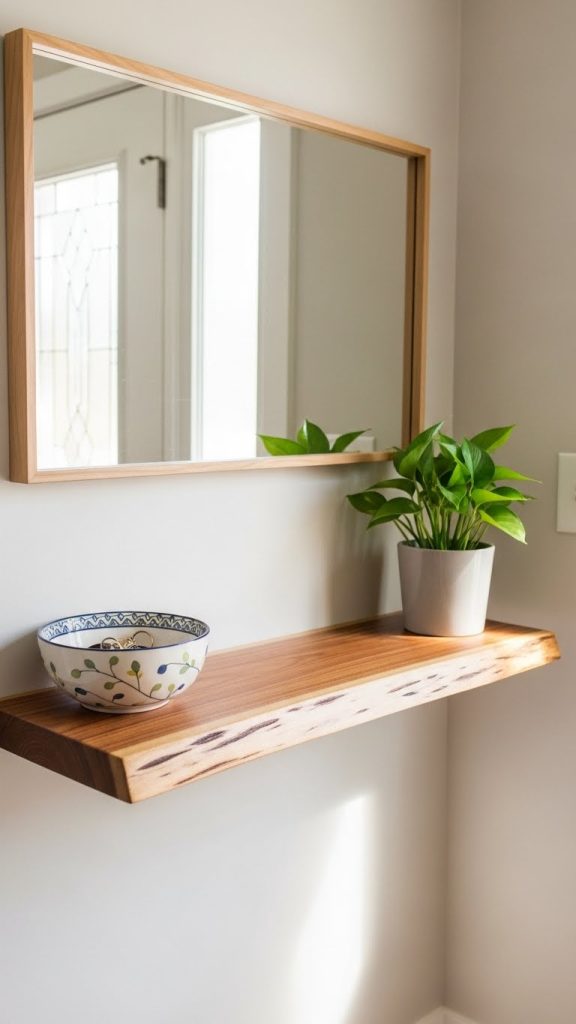Choose a durable wood and ensure the shelf is securely mounted since entryways see frequent use.