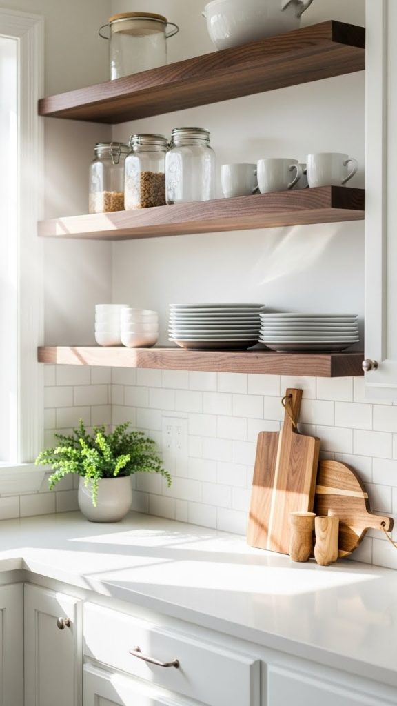 Install live edge shelves above countertops or near windows to store everyday items like plates, bowls, mugs, and jars. Dark woods like walnut or acacia pair beautifully with white cabinets, subway tile backsplashes, and matte black hardware.