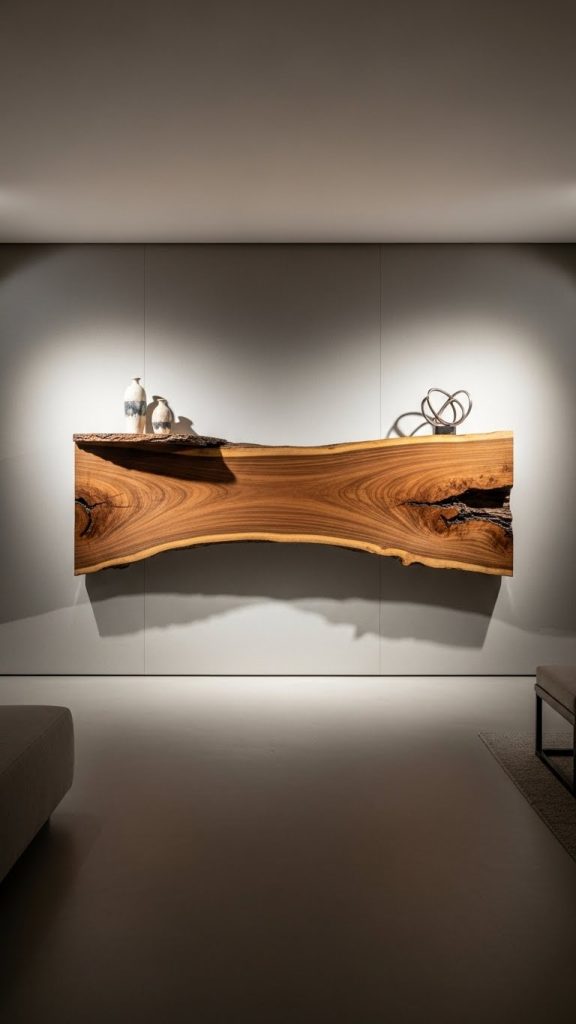 Install one oversized live edge shelf or a series of shelves with varying lengths to create visual movement. This works beautifully in dining rooms, living rooms, and open concept spaces.