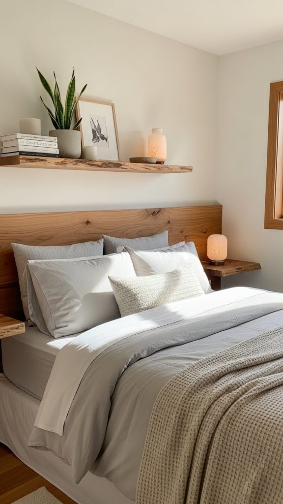 Bedrooms benefit from natural materials that promote relaxation. Live edge shelves can replace traditional nightstands or wall shelves in bedrooms.