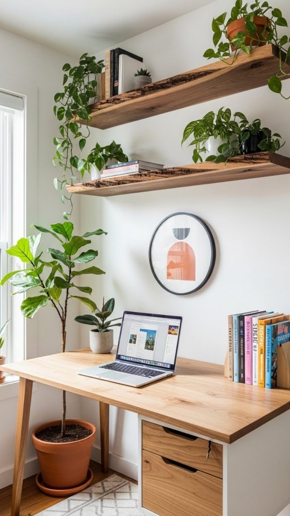 Decorate with plants, framed art, and a few personal items to make the space feel inviting. The natural wood texture can also help reduce visual stress and improve focus.