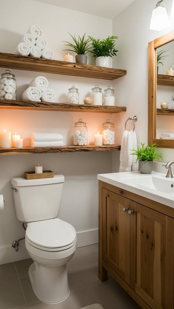 Keep the styling light and airy. Use white towels, glass jars, and minimal decor to prevent the space from feeling cluttered. Proper sealing is essential to protect the wood from humidity.