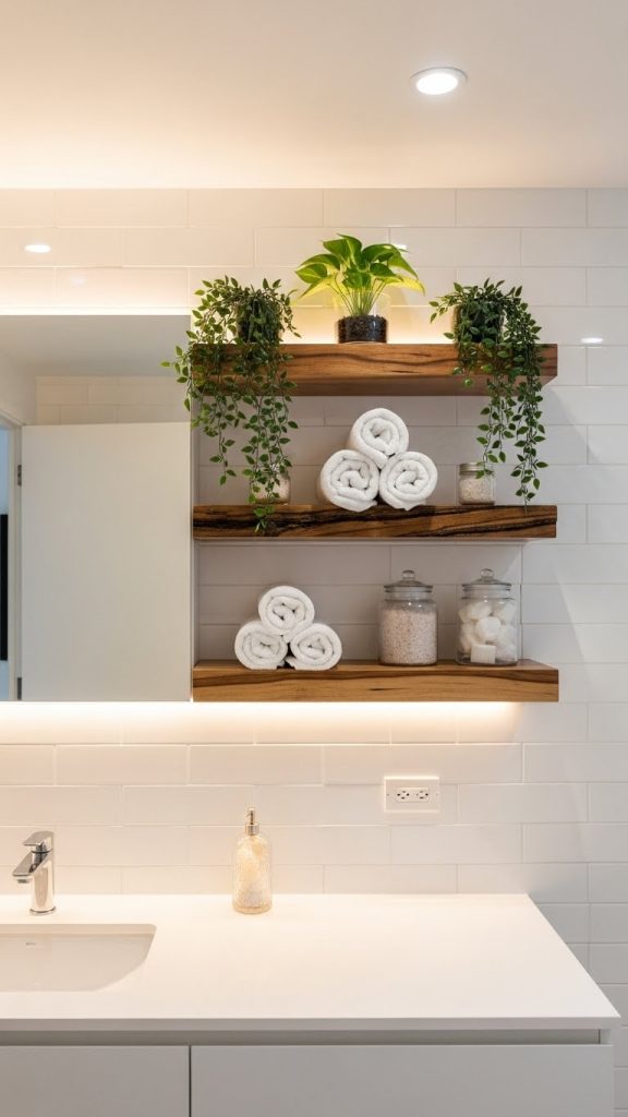 Floating live edge shelves above the toilet or near the vanity create spa like elegance.