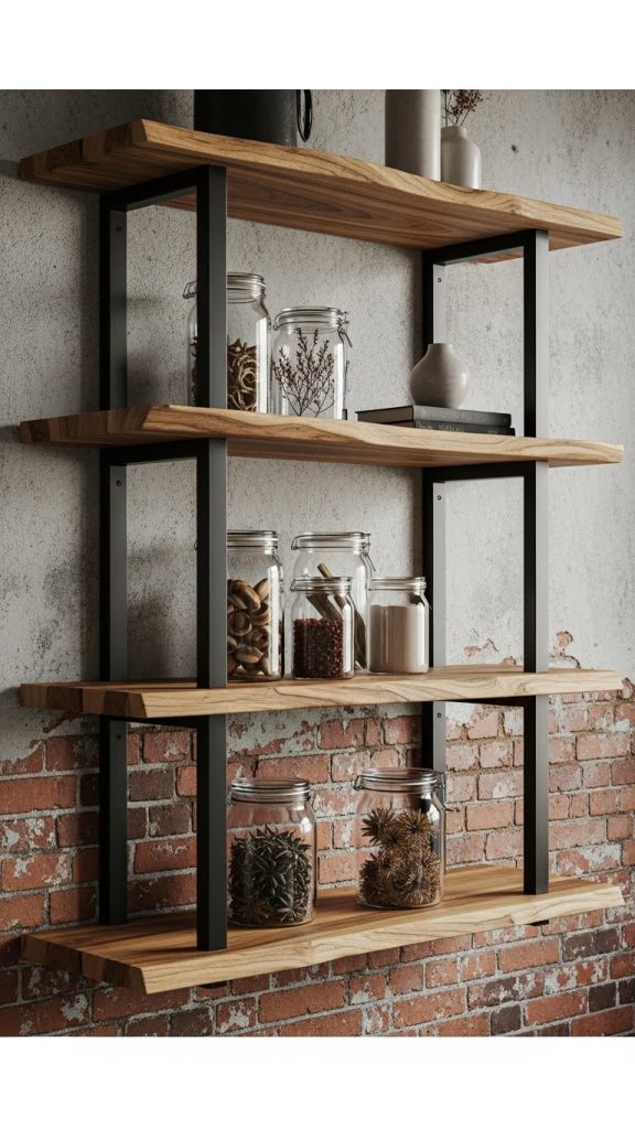 One of the most popular styles combines live edge wood with black metal brackets. This industrial inspired look works well in lofts, urban apartments, and modern rustic homes.