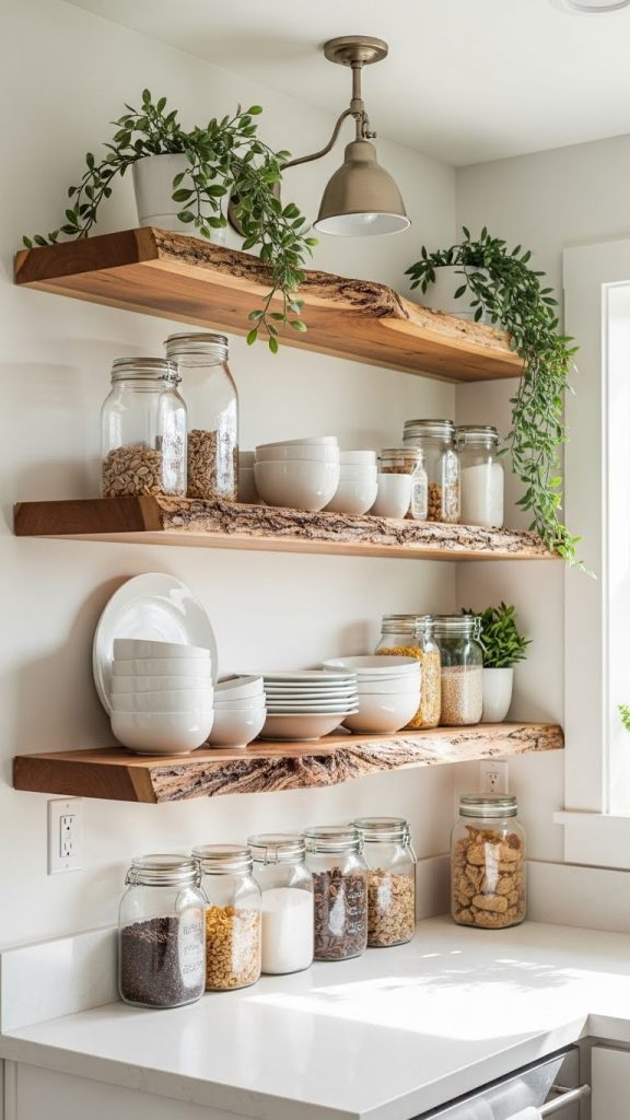 Live edge shelves in the kitchen are both decorative and functional. They replace traditional cabinets and help create an open, airy feel.