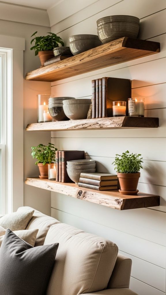 Rustic live edge floating shelves are perfect for farmhouse kitchens, cozy living rooms, and cabin inspired homes. These shelves typically use thick slabs of wood such as oak, walnut, or pine with visible knots and grain.