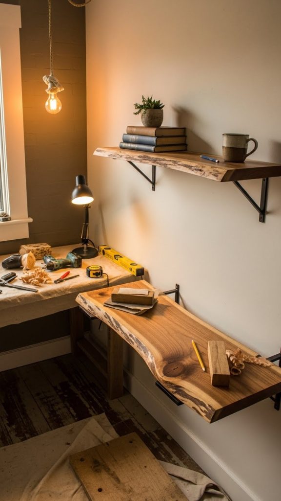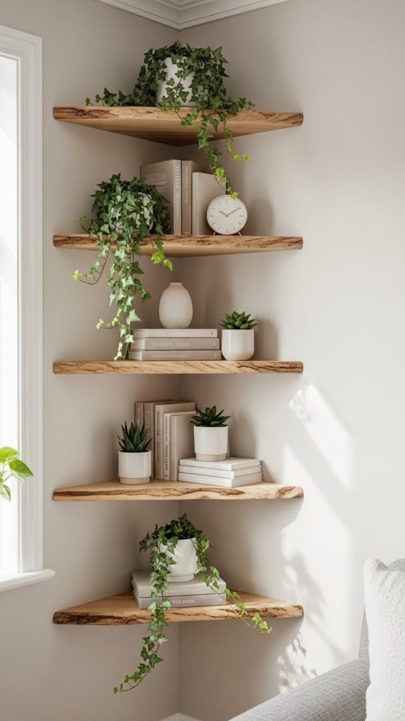 Corner live edge shelves are perfect for plants, books, or small decor pieces without overwhelming the space.