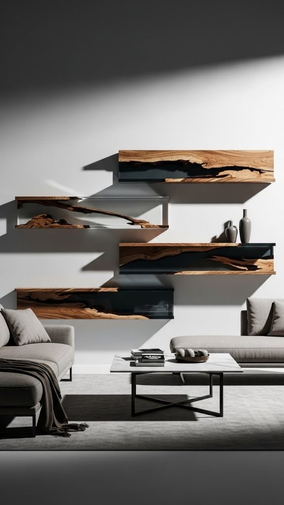 For a unique and artistic look, some live edge shelves incorporate resin. Clear, black, or tinted resin fills cracks or gaps in the wood while preserving its natural edge.