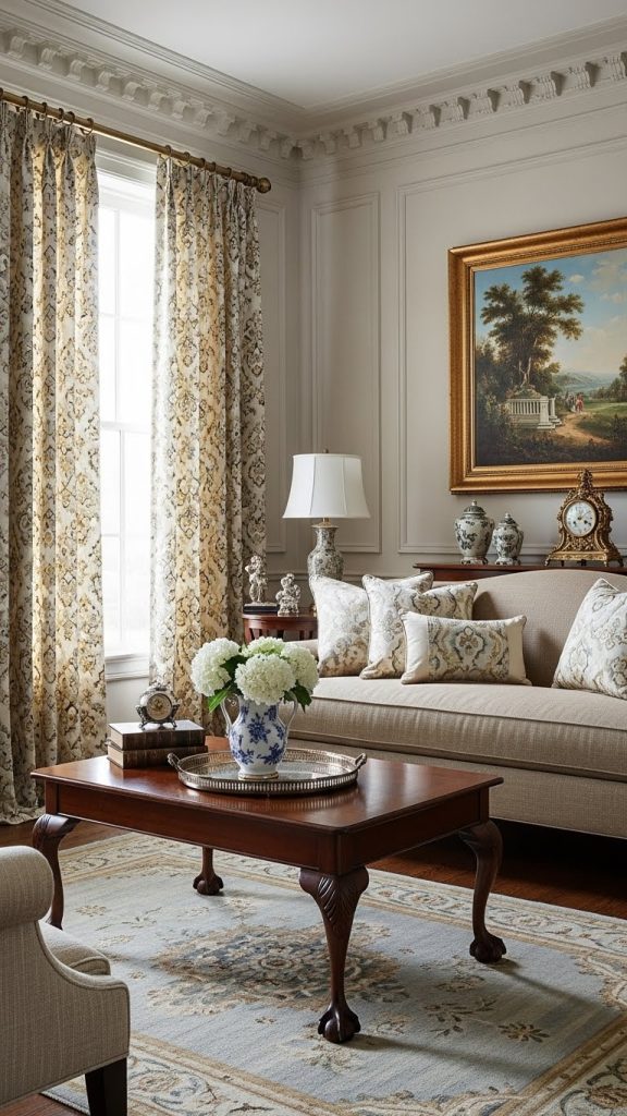 4. Classic Living Room with Patterned Curtains