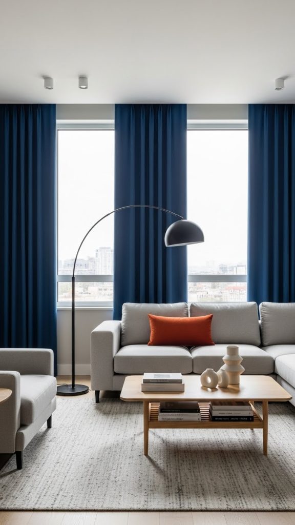 Choose one strong color that ties into your living room decor. This could be a deep blue, olive green, terracotta, or even black in modern spaces. Solid curtains create a striking contrast against neutral walls and furniture.