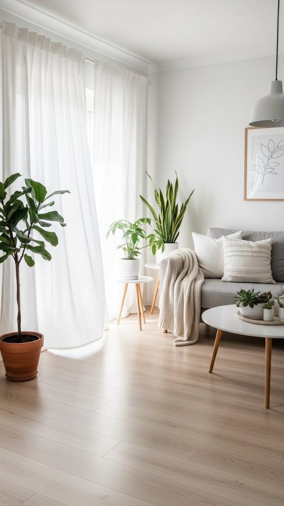 8. Scandinavian Living Room with Soft White Curtains