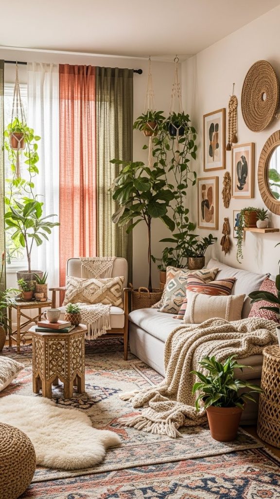 9. Boho Living Room with Textured Curtains