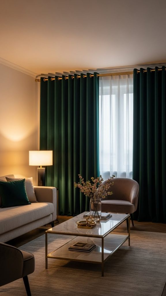 Velvet curtains work best in living rooms with statement sofas, layered lighting, and rich textures like marble, glass, or metallic accents. They also provide excellent insulation and privacy.