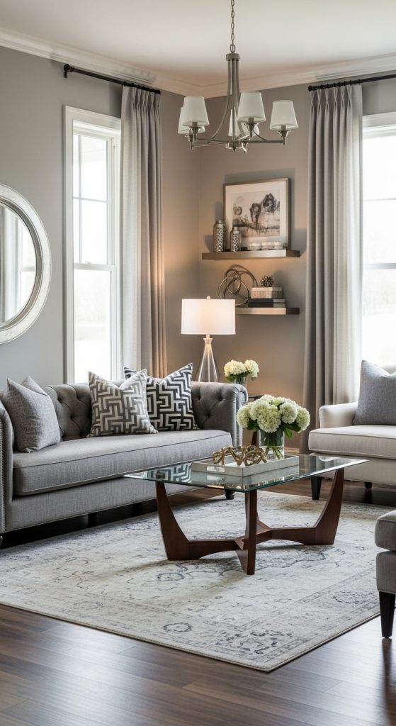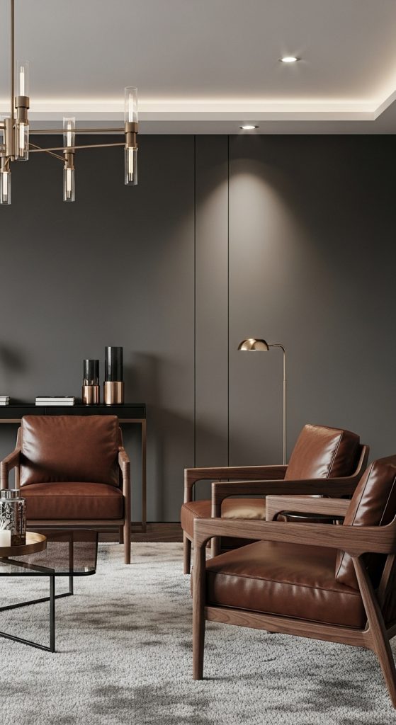 Accent walls painted in deep charcoal gray can add sophistication, while furniture in rich chocolate brown creates a warm contrast. Metallic finishes like brushed brass or chrome can be incorporated through lighting fixtures and decor.