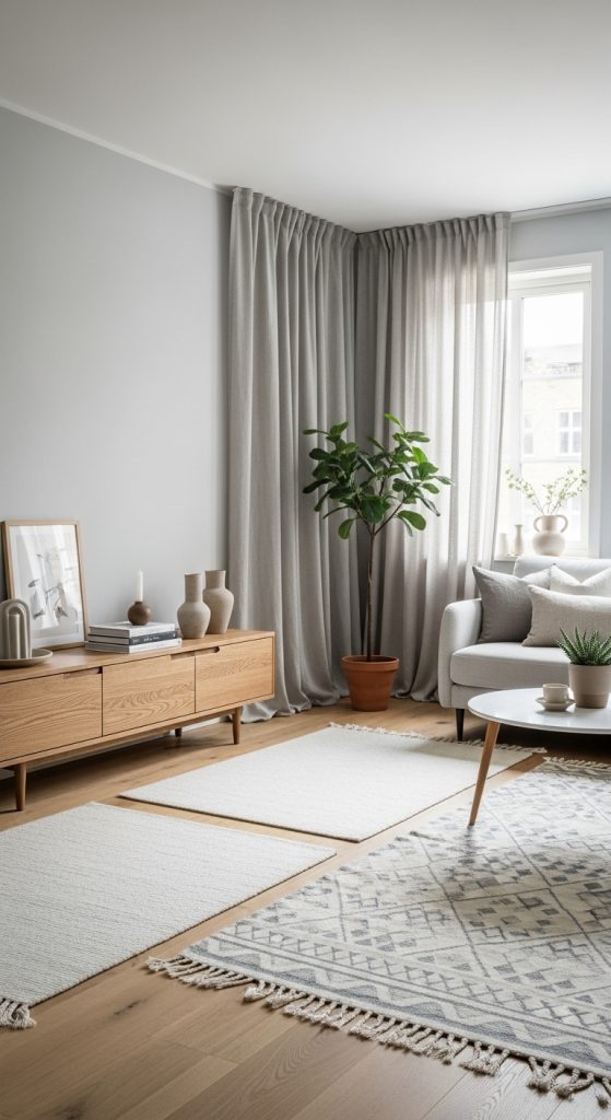 A soft gray rug anchors the space, while natural wood elements such as side tables or floating shelves introduce warmth. Choose furniture with slim legs and geometric shapes to maintain an open, airy feel. Recessed lighting and neutral curtains complete the look.