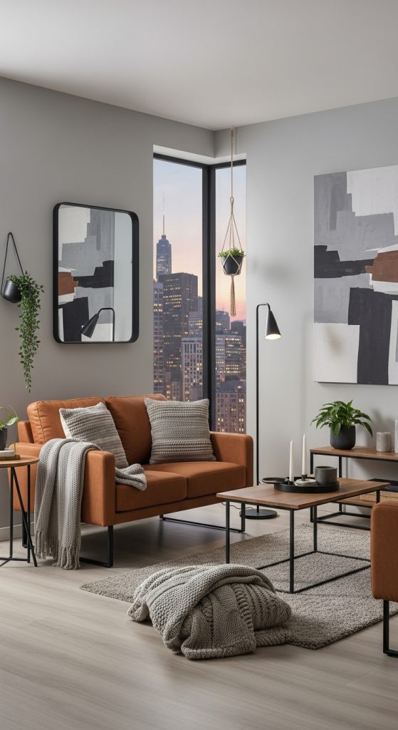 Use mirrors and large artwork to make the room appear bigger. Add black or metallic touches for a city-chic vibe, such as black-framed art or a sleek metal floor lamp.