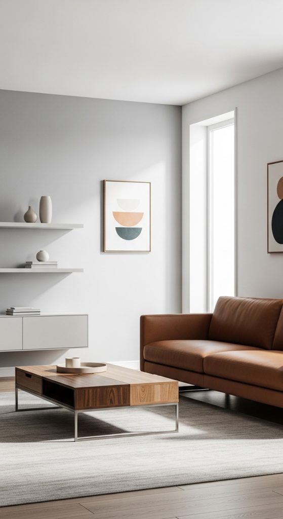 For those who love clean lines and uncluttered spaces, a minimalist approach is perfect. Start with a light gray base on the walls and pair it with sleek brown leather furniture. Keep the decor simple—opt for a single large piece of art or a statement coffee table made of wood and metal.