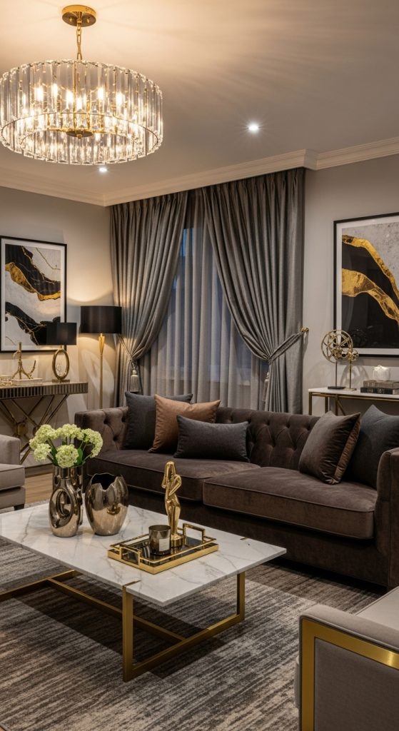 Start with dark gray walls for a dramatic backdrop, and add plush brown velvet sofas or leather seating. Incorporate marble tables, metallic accents, and statement chandeliers to enhance the opulent feel.