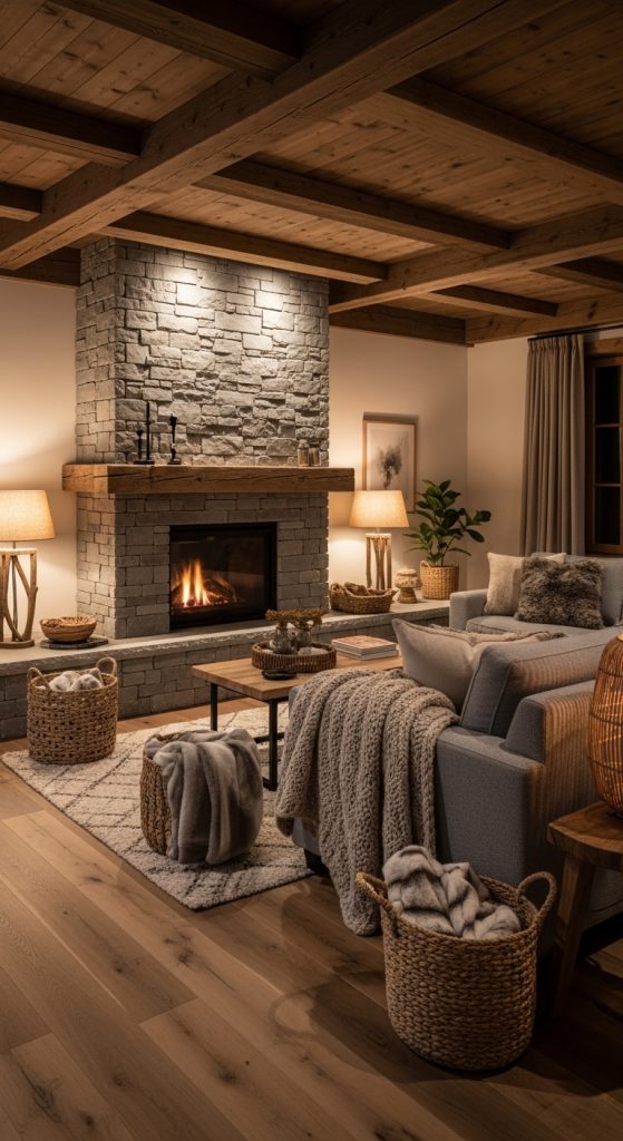 A stone fireplace in gray tones creates a beautiful focal point, while wooden beams on the ceiling add natural texture. Soft lighting from table lamps or wall sconces enhances the inviting atmosphere.