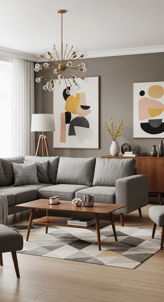 For walls, opt for light gray to make the room feel spacious, and add accents like mustard or olive green cushions for a subtle pop of color. Geometric artwork and statement lighting, such as a starburst chandelier, bring in the retro feel.