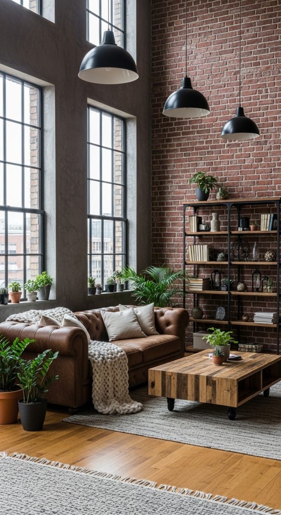 An industrial-style living room thrives on texture and contrast. Combine dark gray concrete walls or exposed brick with brown leather sofas for a modern urban feel. Add metal accents like black iron shelving, industrial-style pendant lights, and reclaimed wood coffee tables.