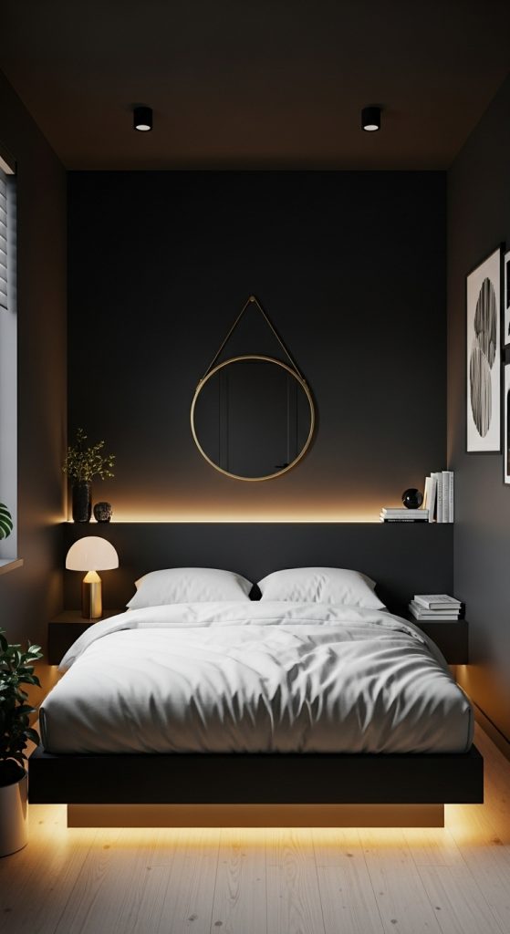 While many people assume small rooms must be painted white, a dark tiny room can feel surprisingly stylish and bold. Deep charcoal, forest green, navy blue, or matte black walls can make the space feel luxurious and modern. The key is pairing dark walls with the right lighting and furniture arrangement.