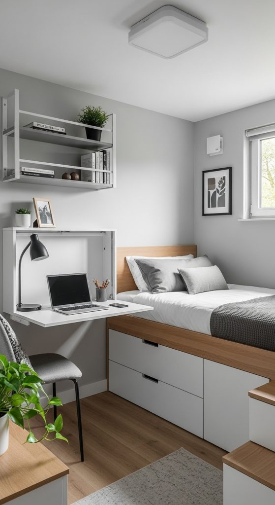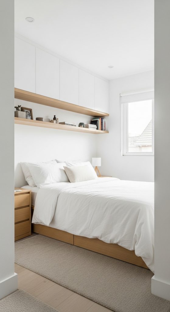 Minimalist tiny rooms are one of the most popular modern aesthetics today. The combination of white walls and light wood furniture creates a fresh, clean, and airy look. Despite the small footprint, the room feels spacious because the color palette stays simple and cohesive. Using white bedding, light wooden shelves, and soft beige accents helps maintain visual calmness while still looking modern.