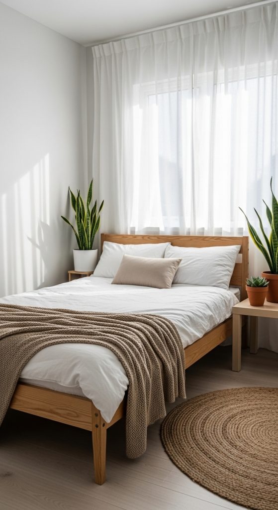 Natural light plays a big role in this aesthetic. Keep window treatments light and airy, allowing sunlight to brighten the entire room. Small details like indoor plants, minimalist framed art, linen bedding, and soft rugs create warmth without overwhelming the space. Scandinavian tiny rooms feel peaceful, balanced, and incredibly modern.