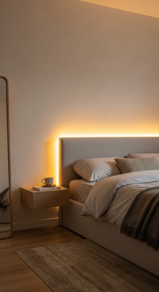 Lighting plays a huge role in transforming tiny rooms into modern aesthetic spaces. LED lights especially warm white or natural white create ambiance, dimension, and softness. You can place LED strips behind the headboard, under shelves, along the ceiling edges, or around the desk area.