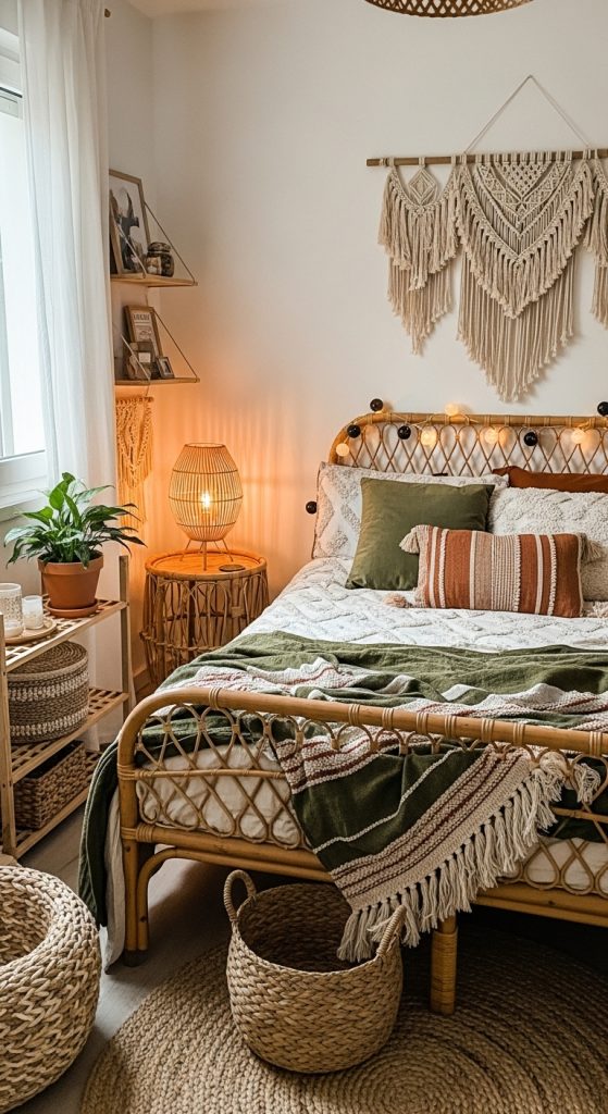 Even in small rooms, layering textures is essential to achieve a cozy boho feel. Think cotton, wool, linen, and light knits. Choose a simple color palette of cream, tan, and warm brown tones so the space stays visually balanced. Add warm lighting, woven lamps, and minimalist decor pieces to maintain harmony. This style makes even the tiniest room feel warm and welcoming.
