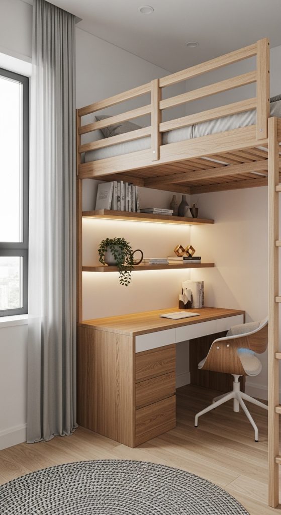 One of the smartest ways to maximize space in a tiny room is by using a lofted bed. Elevating the bed opens up the floor area beneath, allowing you to create a small workspace, closet area, or cozy relaxation nook. This design is modern and functional, especially for tiny apartments or student rooms.