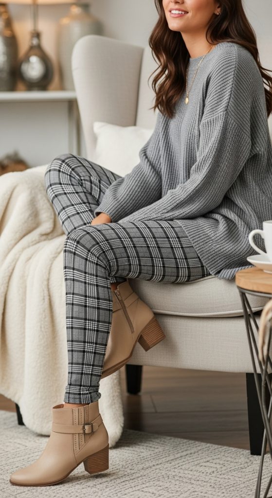 Winter is the perfect time to experiment with patterns. Pair patterned leggings, like plaid or houndstooth, with a solid oversized sweater. This creates a balanced and stylish outfit without overwhelming your look. Keep accessories minimal, such as stud earrings and a simple crossbody bag.