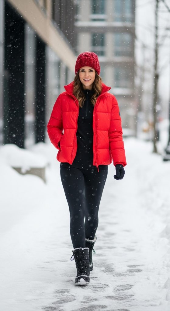 For extremely cold days, layering is key. Pair leggings with a puffer jacket for a functional yet fashionable winter outfit. Choose a fitted top underneath, such as a long-sleeve t-shirt or light sweater. Complete the outfit with winter boots and a knitted beanie.