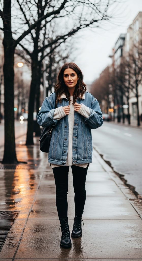 Denim jackets aren’t just for spring or fall; they can be layered in winter too. Pair leggings with a knit top and a slightly oversized denim jacket for a relaxed and trendy look. Add combat boots or ankle boots to complete this casual outfit.