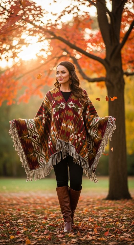 Ponchos and capes are stylish alternatives to traditional coats. Pair leggings with a wool poncho for a boho-chic winter outfit. This combination is comfortable, warm, and perfect for layering. Add knee-high boots and a slouchy bag for a complete look.