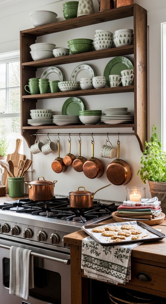 Display your prettiest dishes on open shelves, or stack them in glass cabinets to add both function and decoration. You can also hang copper pots and pans — their rich tones reflect light beautifully and give a luxurious yet rustic winter vibe.