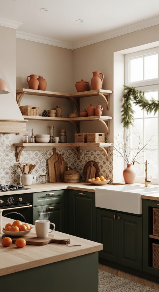 If you prefer neutral tones, you can still warm things up by layering natural textures — think wooden bowls, rattan baskets, or stoneware dishes. These elements complement soft lighting and make your kitchen feel more inviting.